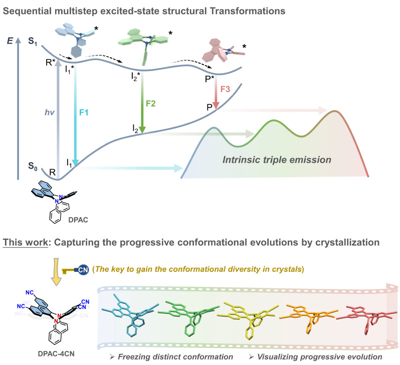 Recently, the research team of Academician Tian He from the Joint Research Center of Feringa Nobel Prize Scientists of the School of Chemistry and Molecular Engineering of our university successfully captured the gradual evolution process of hindered dihydrophenazine molecular conformation by crystallization locking conformation, which provided direct structural evidence for further understanding the dynamic behavior of VIE molecules. The research article was published in Angewandte Chemie with the title of “Capturing the Progressive Conformational Evolutions of Sterically-Congested Dihydrophenazinesvia Crystallization”.